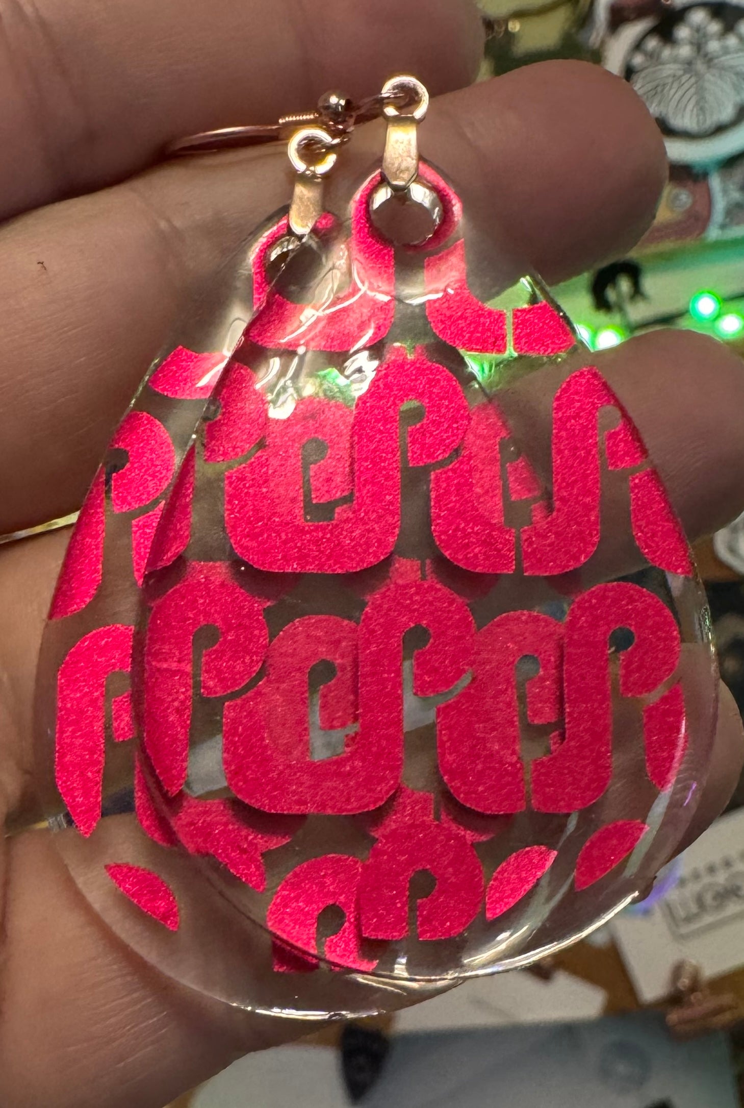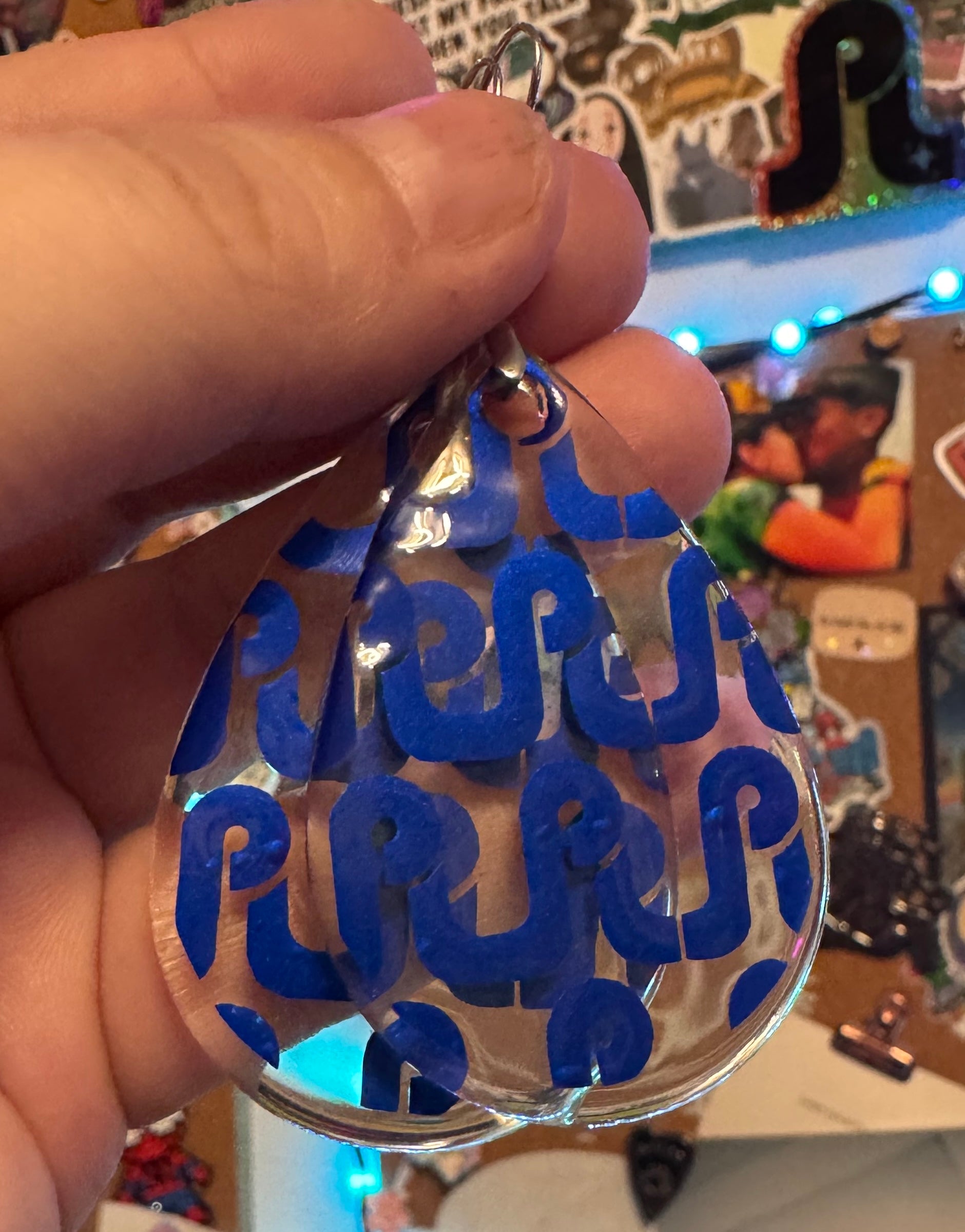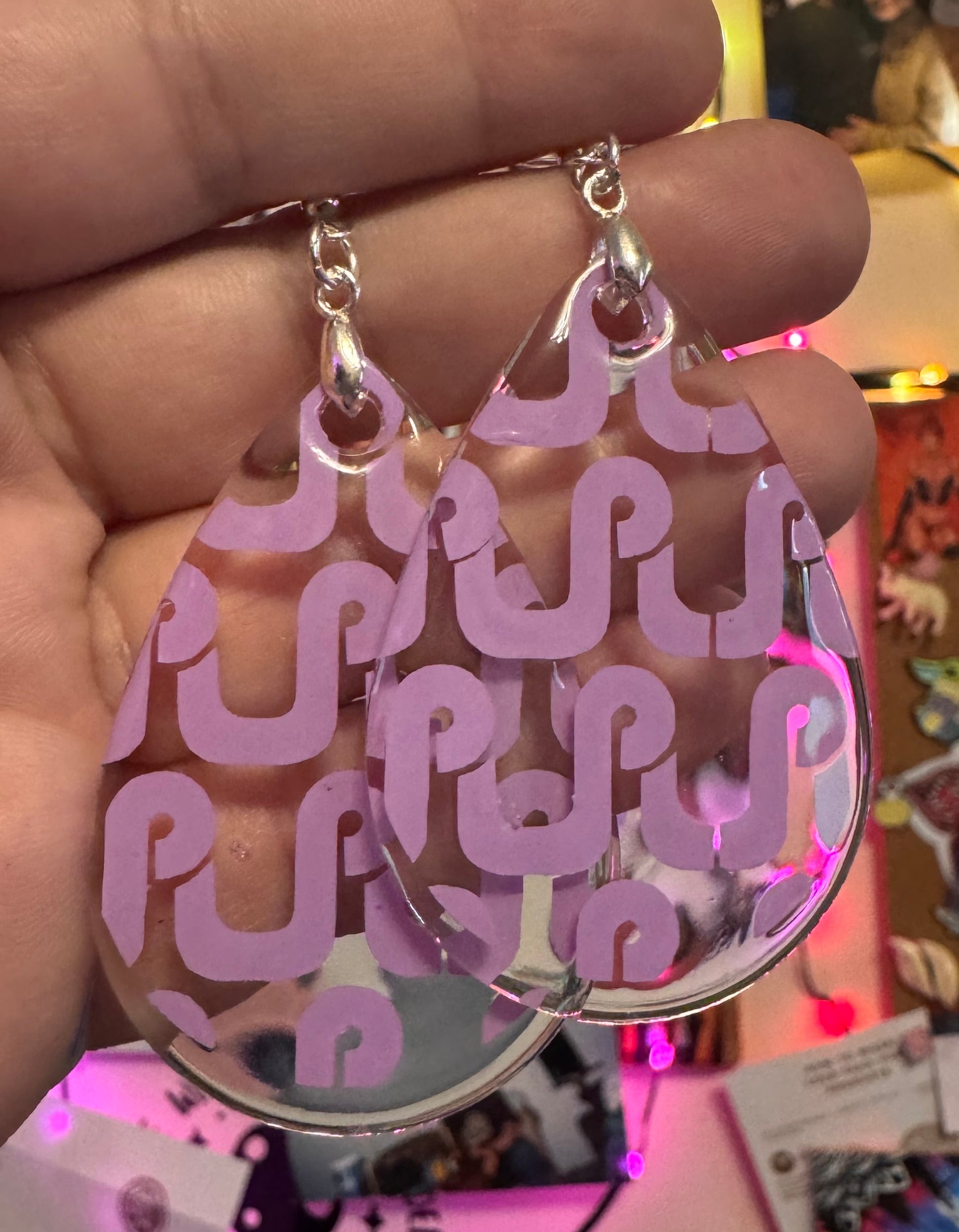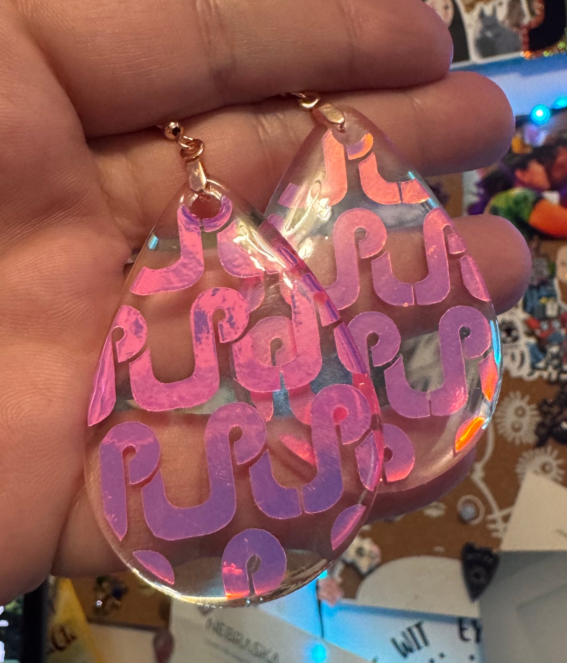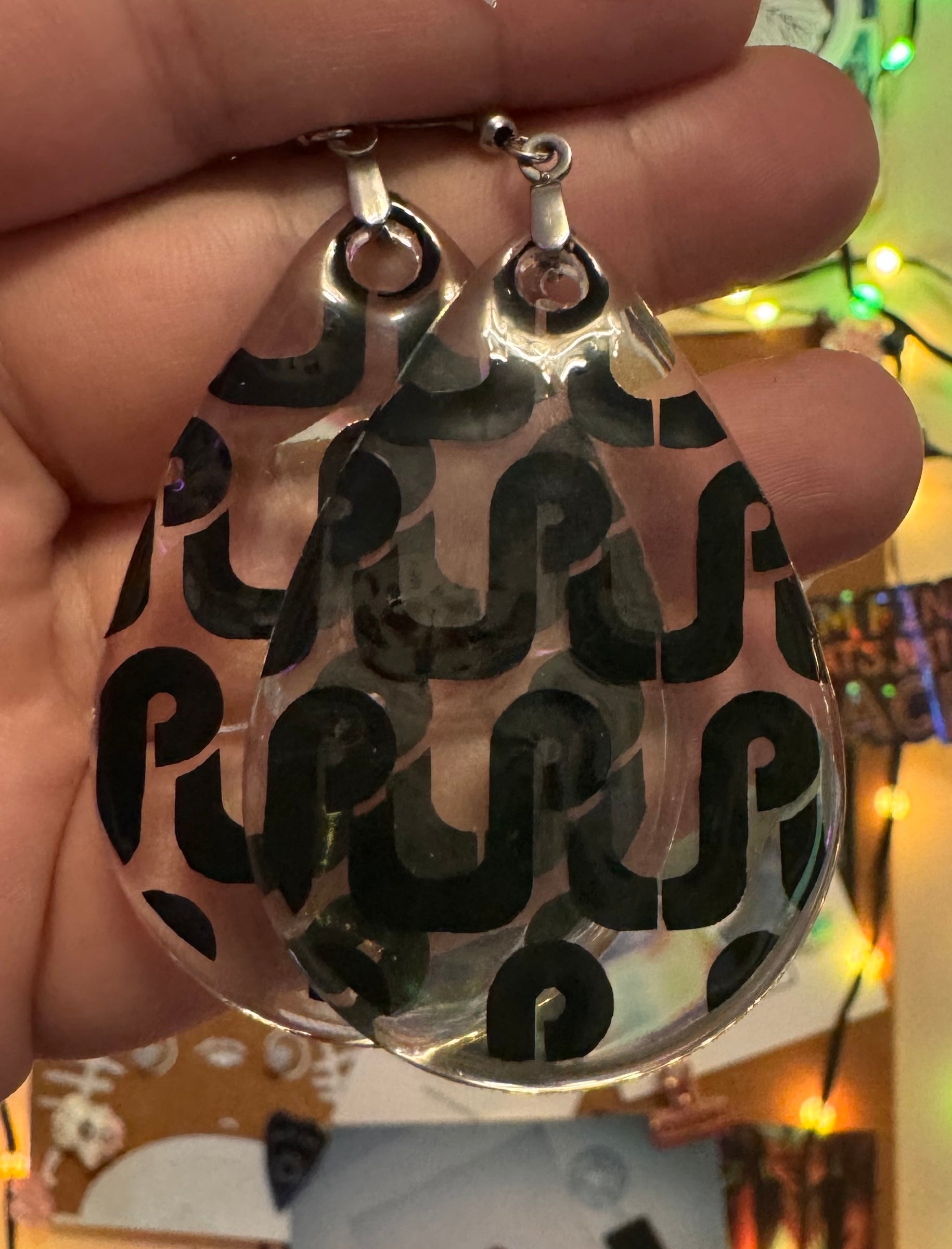 These Pretty Lights logo resin earrings are handmade to order and available in over 100 vinyl color/pattern options. After purchase, buyers must contact me to select their color before production begins. There are too many to list here!